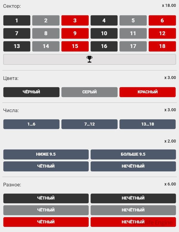 Так, например, ставка на сектор имеет коэффициент 18, ставка на цвет – 3, а коэффициент на чёт/нечет равен 2. Перед началом каждого раунда вы можете сделать неограниченное количество ставок на все возможные исходы.