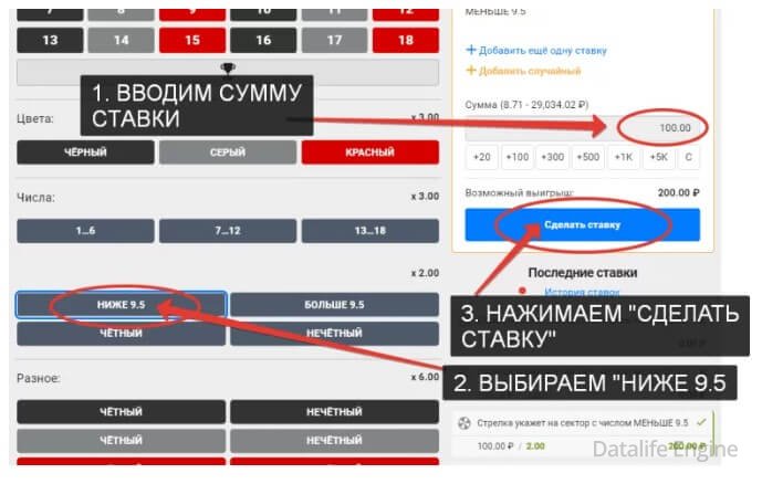 Дожидаемся двух подряд выпадений чисел со значением больше 10. Дальше "Ниже 9,5", вводим сумму ставки и нажимаем " сделать ставку". При выпадении числа от 1 до 9, повторяем ставку. Выпадение чисел от 10 до 18, считается проигрышной операцией, при которой следующая ставка увеличивается в 2 раза. Продолжаем действия до тех пор, пока не наступит выигрыш. После выигрыша нужно вернуться к базовой ставке. При удвоении ставки, мы возвращаем в случае выигрыша все что проиграли до этого. Например, если мы ставим 50 р, проигрываем, ставим 200, проигрываем, ставим 400. Выигрываем - возвращаем 750 р и 50 р - выигрыш. Снова ставим 50 р и действуем по старой схеме. Все предельно просто, главное не торопиться и запастись терпением.