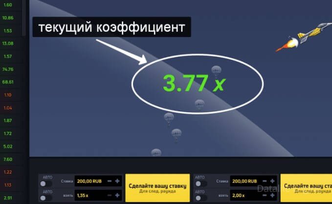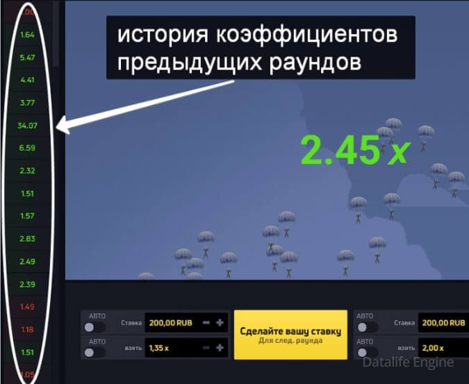 Слева на экране представлена история коэффициентов, на которых закончились предыдущие раунды (значение коэффициента на момент взрыва самолёта). Значения отображаются зелёным и красным цветами: красным цветом обозначаются коэффициенты меньше 1.5, а зелёным – более 1.5.