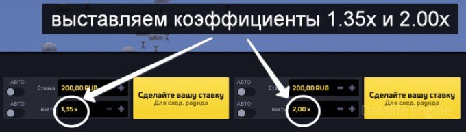 В первом поле выставляем значение коэффициента 1.35 x, во втором 2.00 x: