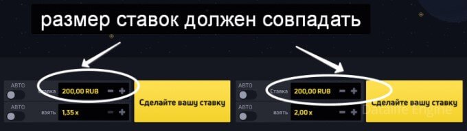В стратегии будем использовать обе ставки в каждом раунде и использовать “автоигру”. Автоигра позволит нам не наделать ошибок и вовремя реагировать на нужный коэффициент. А использование сразу двух ставок в раунде позволит первой ставке страховать вторую, благодаря правильным значениям коэффициентов.