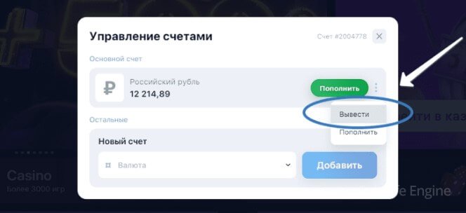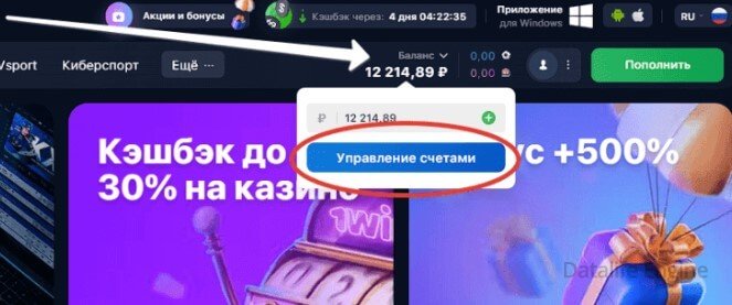 Для вывода выигрышей наведите курсор на баланс (в самом верху) и в выпадающем окне нажмите кнопку «Управление счетами».