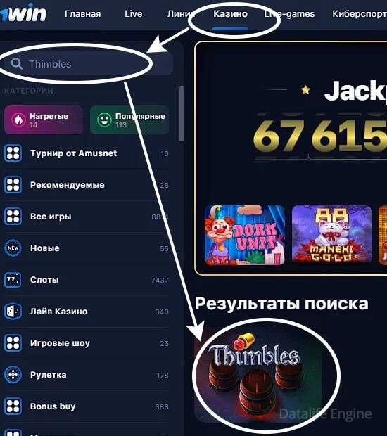 Для доступа к игре "Напёрстки" вам нужно перейти в раздел "Казино" и ввести "Thimbles" в поисковую строку. Затем выберите нашу игру из результатов поиска. Подробная инструкция представлена на скриншоте.