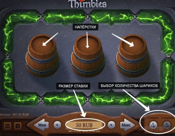 После выбора режима игры начинается процесс перемешивания. Затем вам необходимо определиться с напёрстком, под которым находится шарик. Сумма ставки будет списана с вашего счёта после нажатия на один из напёрстков.