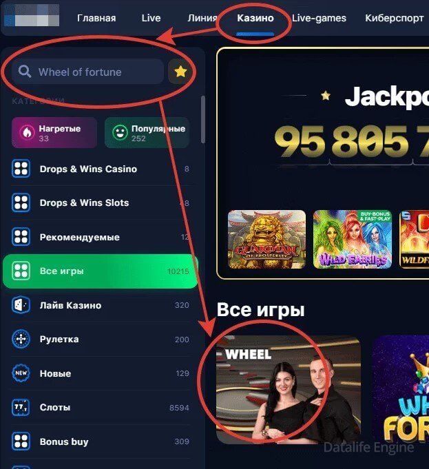 Вы также можете найти эту игру, используя поиск в разделе "Казино", введя в поисковую строку название на английском языке - "Wheel of Fortune", как показано на примере скриншота: