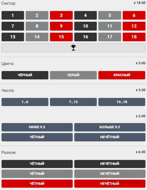 - на сектора (номера 1-18 и сектор “Кубок” – аналог Зеро в рулетке);