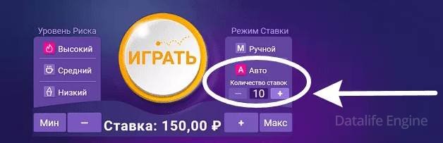 - Уровень риска: Размер возможного выигрыша напрямую зависит от выбранного уровня риска. Мы можем выбрать один из трех вариантов – низкий, средний и высокий. По мере возрастания рискованности ставок увеличиваются максимальные выплаты и снижаются минимальные множители.